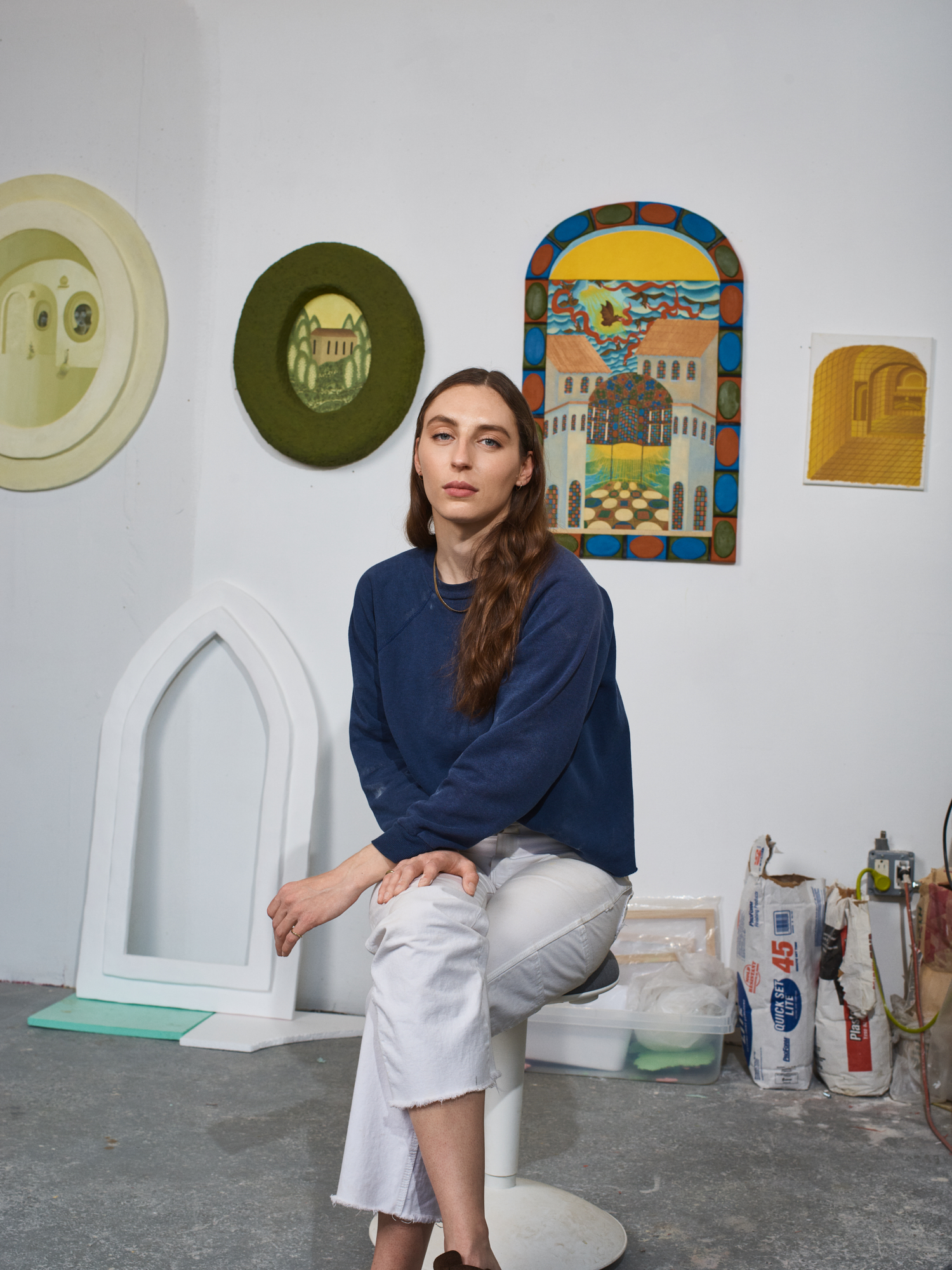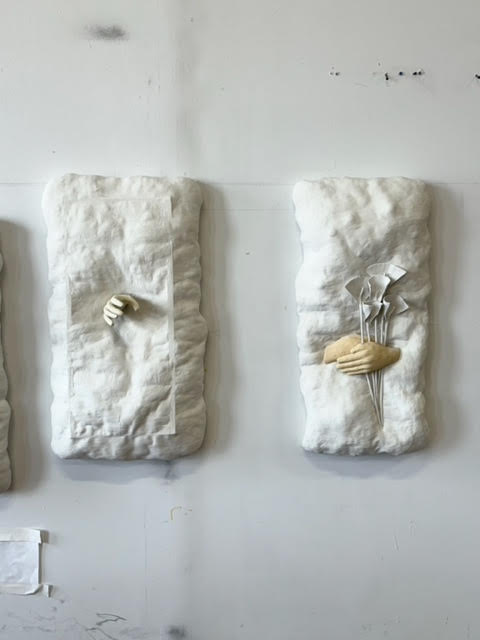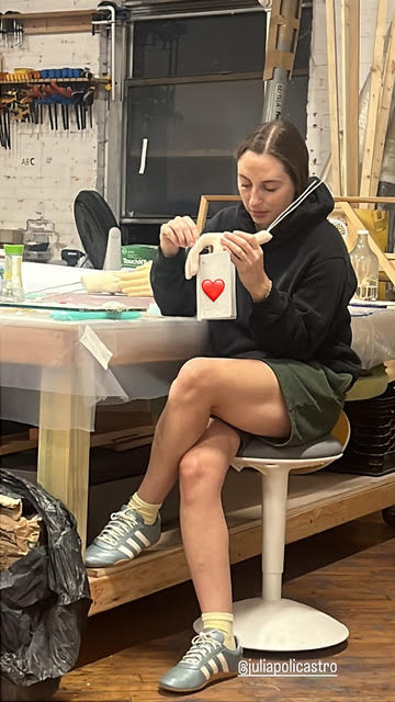 Born in Buffalo, New York and trained in sculpture and ceramics at Tyler School of Art, Julia Policastro has developed a practice that lives between object and image, structure and softness. Early work experiences at the Fabric Workshop and Museum and alongside artist Karen Kilimnik shaped her approach to material, surface, and storytelling, prompting an evolution from sculpture to painting — and eventually, a merging of the two.